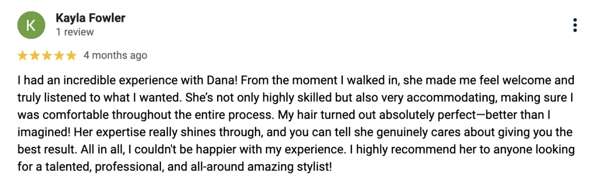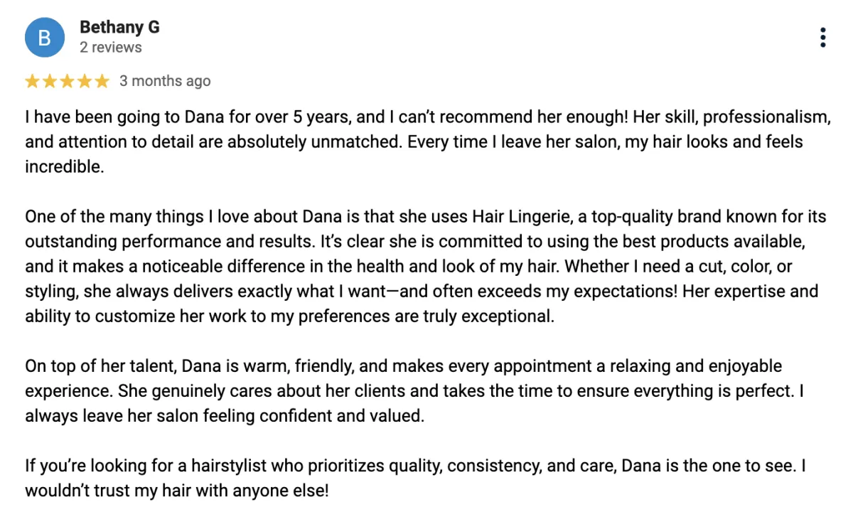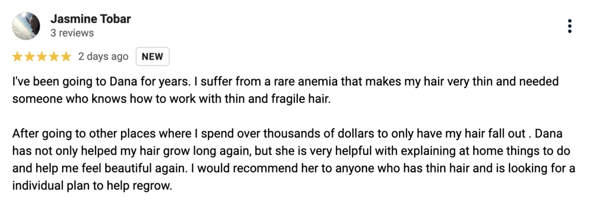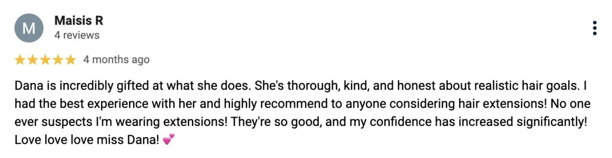 Founded by Dana, who brings over a decade of experience in hair restoration and extensions, our salon prioritizes both hair health and aesthetics. Her expertise comes from extensive training with industry leaders and deep understanding of hair anatomy.